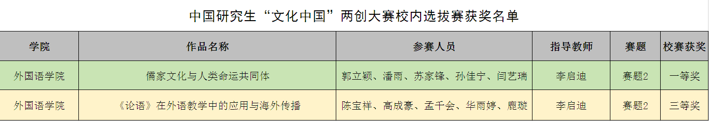 学院高度重视研究生创新创业工作,积极对接国家重大战略需求,在本次“文化中国”两创大赛校内选拔赛中,学院积极鼓励广大研究生参赛,充分发挥外语专业的学科优势,为做好中华文化的传播者贡献了青春力量,凸显了我院的育人实效。