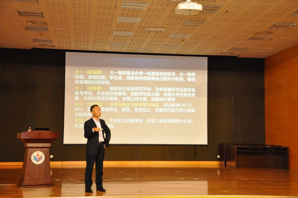 2023年10月25日下午,英国正版365首页在长清湖校区图书馆负一楼报告厅成功举办《国际人才英语》课程校外导师进课堂暨国际人才培养系列讲座。本次讲座邀请行业导师、济南橙玥电子商务有限公司创始人、高等院校互联网+创新创业导师评委孙虎先生为我院2023级本科生开展了题为《外语类专业就业前景与规划方向》的主题讲座。英国正版365首页院长王卓教授、大学外语教学部韩冰主任出席了本次讲座。
