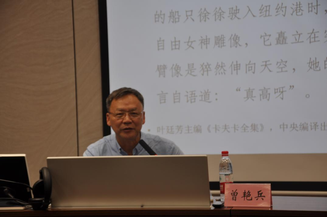 曾艳兵教授首先解释了自己研究的缘由:他在初次阅读《美国》时便存在疑惑,自由女神像手持利剑,为何卡夫卡要把“火炬”写成“利剑”?在英语中,“火炬”和“利剑”这两个词在发音和拼写上都有很大区别,这说明这是卡夫卡有意而为。他认为,“剑”是小说的核心,研究这把“剑”具有一定的现代意义,能够预演美国后面百年的发展路径和可能性。