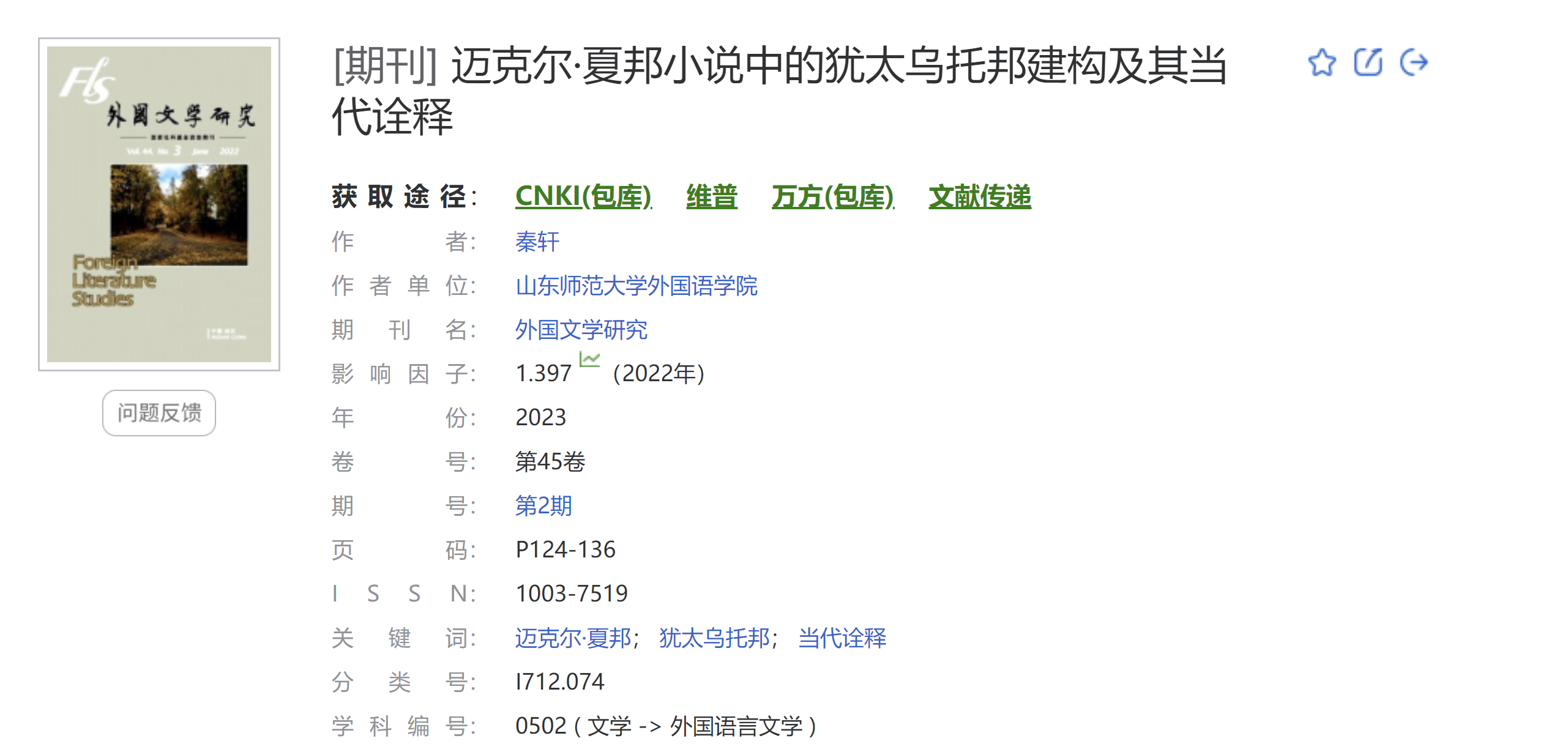 近日,我院教师秦轩副教授的研究成果“迈克尔•夏邦小说中的犹太乌托邦建构及其当代诠释”发表于《外国文学研究》上。该文为秦轩副教授的国家社科基金青年项目的阶段性研究成果,也是我院族裔文学研究团队发表的又一重要研究成果。