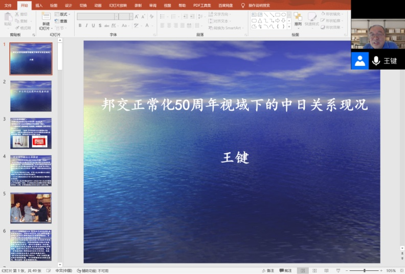 讲座伊始,王键教授分别从“中日复交三原则”“中日四个政治文件回顾”“三千日本青年访华”“日本对华ODA”等方面对中日建交50周年的历史进行了简要回顾,为大家介绍了中日从断交到复交的发展历程。随后,王键教授列举出了目前中日关系存在的主要问题,如“历史教科书问题”“东海与台湾问题”等。接着王键教授向大家介绍了一些日本官方和民间团体组织的一些庆祝中日邦交正常化五十周年的活动,例如日本“继承与发展村山谈话会”等举办的《中日邦交正常化50周年集会》,以及日本浙江总商会联合静冈县日中友好协会共同举办的书法交流展等。