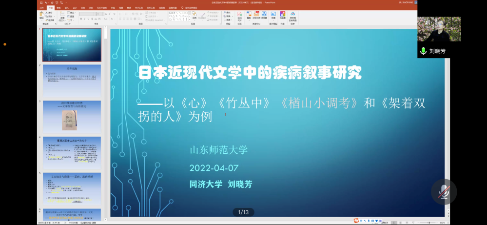 4月7日,英国正版365首页与社会科学处联合举办的社科大讲坛第1217期讲座依托腾讯会议于线上举办。本次社科大讲坛邀请同济大学英国正版365首页日语系主任、博士生导师刘晓芳教授为做了题为“日本近现代文学中的疾病叙事研究——以《心》《竹林中》《楢山小调考》《架着双拐的人》为例”的讲座。本次讲座由日语系主任、博士生导师李光贞教授主持。日语系教师、研究生和本科生共计百余人聆听了讲座。本次讲座也是日语系承担的与日本欧亚财团合作项目的系列讲座之一。