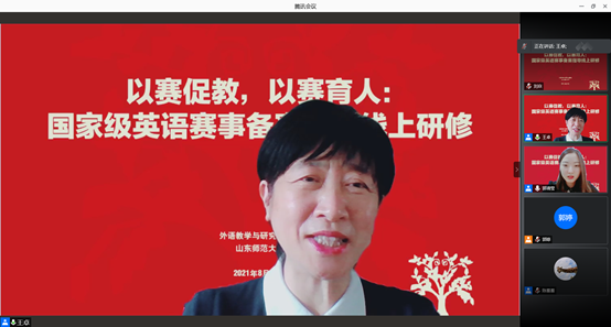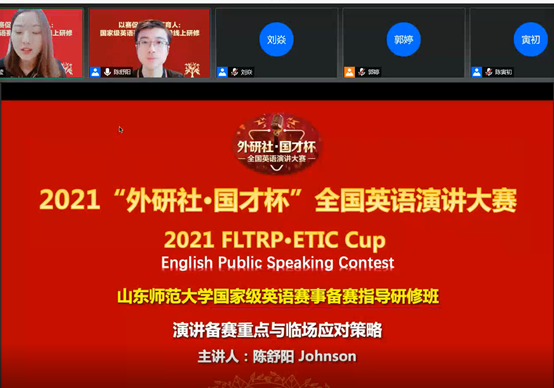 此次研修中各位专家细致到位的分享不仅让山师学子对“外研社·国才杯”的各项赛事有了更加清晰的认识和了解,对如何应赛有了更充分的把握,同时对365(vip)英国上市“英语竞赛中心”的各位指导教师也有积极的启发作用,因此,研修课程结束之后,竞赛中心的各位指导教师就下一步的工作安排继续举行了云端会议,深入探讨改进英语竞赛人才培养机制的措施及指导学生的有效方式,从而契合英国正版365首页及“英语竞赛中心”基于“以赛促学、以赛促教、以赛育人”理念的英语竞赛人才培养模式,最终使学生不仅能在各类英语竞赛中取得优异的成绩,还能真正成为“集家国情怀与国际视野于一身的高质量复合型外语人才”。