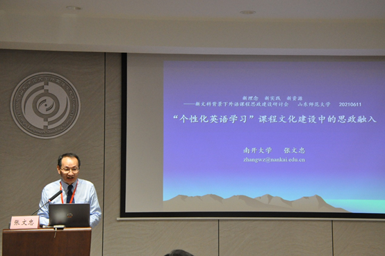 南开大学张文忠教授的报告主题是“‘个性化英语学习’课程文化建设中的思政融入”。张文忠教授从报告的题目出发,结合南开大学的课程实践,介绍了南开大学英国正版365首页“个性化英语学习”选修课程的文化建设创新实践及思政融入课程文化建设的做法。“个性化英语学习”课程旨在通过教师引导,实施一系列学习任务和课堂角色,在这一过程中强调合作学习。张文忠教授提到,课程文化就是一种实践共同体文化,课程文化建设连通思政。课程中的每位参与者都是课程实践共同体的一份子,遵循全人教育理念和赋权增能原则,张教授认为课程文化自动包含了诸多思政元素,课程文化建设即为课程思政,立德树人的思政无处不在。张文忠教授最后提到,在这种课程实践共同体文化中,课程文化是用来浸润的,外语思政需润物无声,育人于细节。