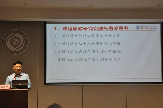 中国石油大学(华东)毛浩然教授的报告题目为“外语课程思政核心要素的加法与减法”。毛教授从课程思政研究实践热的冷思考,外语课程思政核心要素做加法和外语课程思政核心要素做减法三方面出发,论述目前思政建设存在的问题,他认为要对核心要素和精准滴灌做加法,对无关要素和大水漫灌做减法,确保外语课程思政内涵的系统性、前沿性和包容性,倡导外语课程思政“少许”“若干”的适时适量、水乳交融若隐若现的精准融合、精心设计随意表现的浑然天成。毛教授提出要有“全球视野,不忘本来,吸收外来,面向未来”的觉悟。