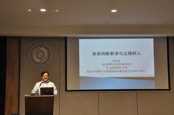 河北师范大学李正栓教授以“英美诗歌教学与立德树人为题,首先介绍了诗歌的教诲功能、愉悦功能和感动功能。他提到,作为教师要注重教师育人,挖掘诗歌思政内涵,培养德才兼备的人才。通过翻译欣赏诗歌,培养学生对祖国语言的热爱与文化自豪和自信。李教授还提出,歌即诗,诗即歌;在比较当中学习;让学生学习评论和提问;鼓励学生仿写和创作等理念方法,他认为诗歌讲解应该通过讲解、比较、对比、翻译、创意写作、互动等手段使学生潜移默化的融入课堂,在润物细无声中感受到学习诗歌的愉悦并进行双向学习和跨文化思考。