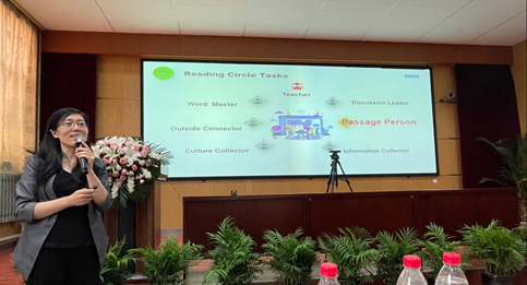 王卓院长以“学科专业一体化视域下英语专业《综合英语》课程改革”为题,做了大会主旨发言。她指出按照《普通高等学校本科英语专业教学指南》要求,《综合英语》课程应充分体现英语学习的整体性和综合性。在新文科背景下,《综合英语》的整体性和综合性一方面体现在综合性知识建构,另一方面体现为综合性学习。前者要求以外语学科的内在和外在跨学科性为基础,构建以内容为基础的跨学科知识体系;后者要求以深度学习为有效模式,作为跨学科整合路径。王卓院长提出,在教学实施中,我院《综合英语》教学团队创新性采用“混合式深度学习圈”(BDLCs)模式,有效地实现内容的跨学科知识体系性整合和教学方法的综合性学习整合,体现了学生中心,产出导向的教学理念,从而实现在语言学习中提升跨文化能力、思辨能力、人文素养和认知社会的功能,并最终实现在语言学习中“再现世界”的目标。