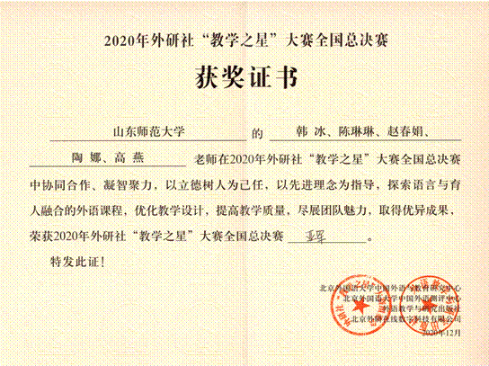 星辉闪耀共襄盛事,胜友重逢相聚云端。12月16日,外研社2020年“教学之星”大赛全国总决赛在北京举办。我院大学英语教学团队经过激烈比拼,在全国18组参赛教师团队中脱颖而出,获得2020年“教学之星”大赛全国总决赛亚军。