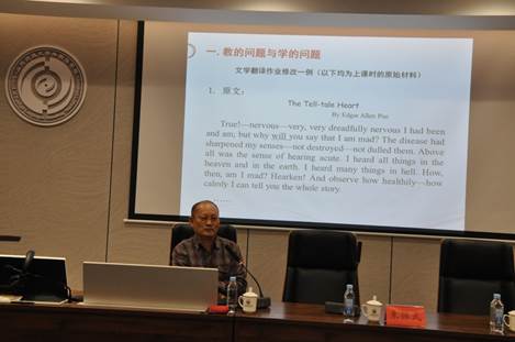 最后,朱教授从冯唐译飞鸟集、 陈东飚译巴塞尔姆到葛浩文译莫言讲解了文学翻译标准的问题。他指出,冯唐的翻译虽然有的地方稍微脱离了一点原文,但并不是瞎译乱译;陈东飚的翻译问题,是因为机器翻译的像人,而非人翻译的像机器;葛浩文的翻译有增、改、删,但大都很适度,亦绝非随意,他其实是万变不离其“忠”。紧接着,朱教授指出我们应该做实证、搞调研、沉下心来思考,而非人云亦云,道听途说,以“熟读古今书,通晓中外体;博采百家长,终能成自己”结语。