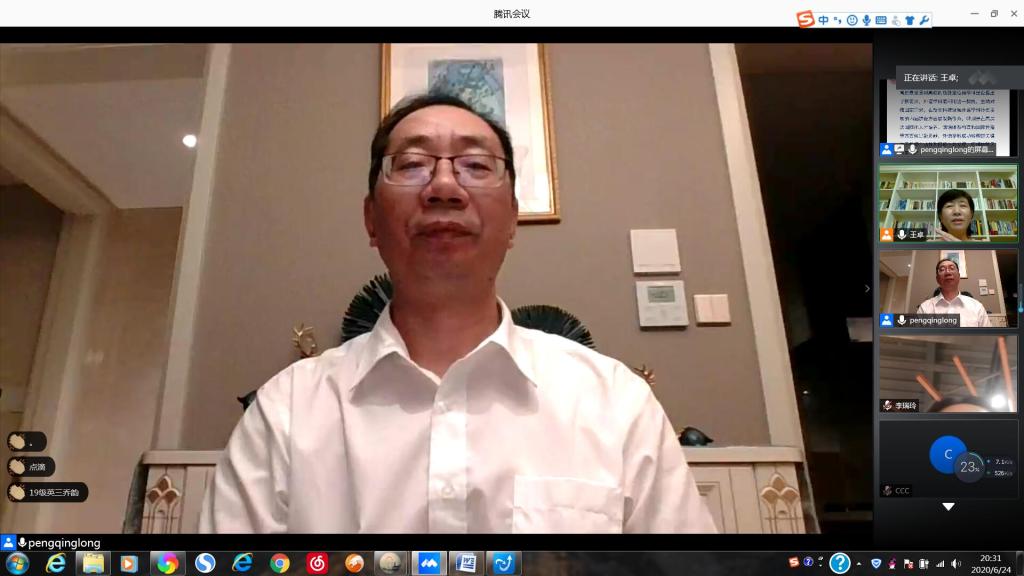 6月24日晚,英国正版365首页联合社会科学处主办的“庆祝365(vip)英国上市建校七十周年系列学术活动”之“社科大讲坛”第997期依托腾讯会议平台顺利举办。讲坛特邀上海交通大学彭青龙教授作了题为“新文科建设与外语学科转型发展”的讲座。本次讲座由英国正版365首页院长王卓教授主持,英国正版365首页全体领导班子成员、各学位点负责人、学科骨干教师、部分研究生和本科生200余人聆听了此次讲座。
