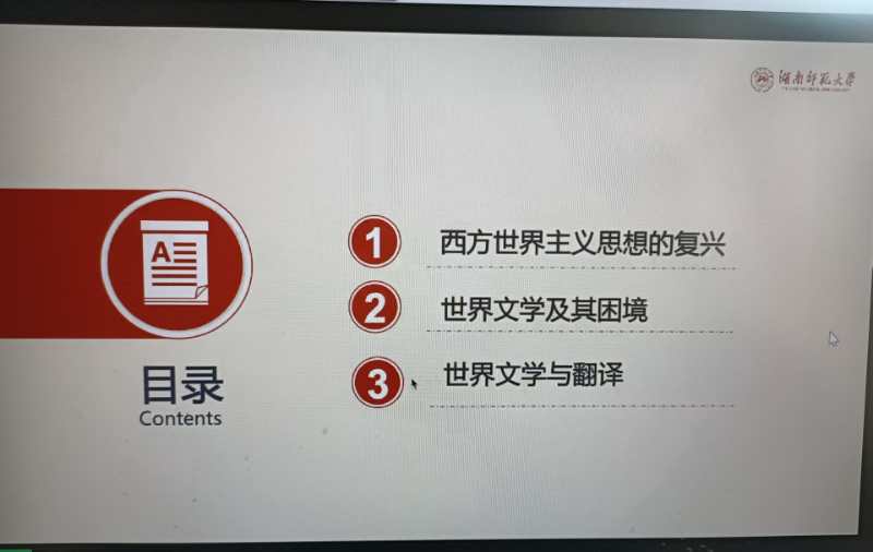 接下来,曾教授以“西方世界主义思想的复兴”为第一个话题,从世界主义的术语诞生、跨学科特征、世界主义复兴的原因等多个角度,结合卡尔霍恩、康德等多位学者的著作和观点对世界主义概念及其思想观念的发展演变,按照时间主线进行了详尽的梳理和阐释,深入溯源了世界主义的发展过程。曾教授通过努斯鲍姆等学者关于教育的论述引出了世界主义与世界文学之间的密切关系,并展开了以“世界文学及其困境”为第二个话题的讲解。在对世界文学溯源的过程中,曾教授从杜威·佛克马等学者对世界主义和世界文学的践行谈起,并对歌德等人对于“世界文学”概念的论述进行了深入阐释。曾教授通过艾田伯的观点提到了世界文学中的困境问题即世界文学中存在的西方中心主义偏见的问题。接下来在对世界文学概念的演变过程进行阐释时,曾教授深入讲解了帕斯卡尔·卡萨诺瓦提出的世界文学空间的观点和达姆罗什提出的“经典的三层次说”,并通过劳伦斯·韦努蒂对于世界文学和翻译的有关观点,引发了大家对于世界文学与翻译之间关系的思考,由此引出对于“世界文学与翻译”话题的阐述。曾教授启发大家对于是否“越是民族的就越是世界的”问题的进一步思考,并指出作为外语人肩负的一种使命就是应当让更多的民族作品成为在世界主义的范围之下的世界文学。