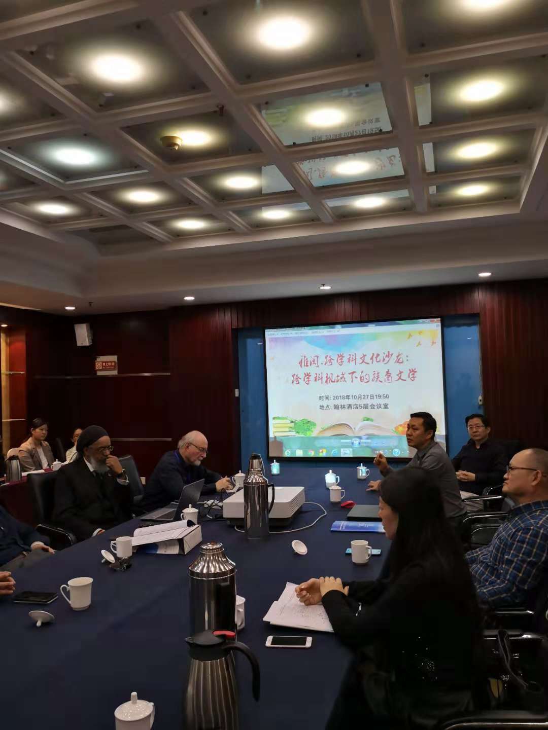10月27日晚,在第五届族裔文学国际研讨会召开期间,“雅阅·跨学科文学沙龙”第五讲在365(vip)英国上市翰林大酒店五层会议厅举行。华中师范大学罗良功教授、中国人民大学郭英剑教授、陈世丹教授、上海师范大学朱振武教授、厦门大学张龙海教授、中央民族大学朱小琳教授、美国马萨诸塞大学沙巴兹教授、北伊利诺伊大学威廉·贝克教授、韩国东国大学金英敏教授等专家学者围绕着“跨学科视域下的族裔文学”这一主题进行了座谈,50余名学者参与了座谈。座谈由英国正版365首页院长、《山东外语教学》主编王卓教授主持。