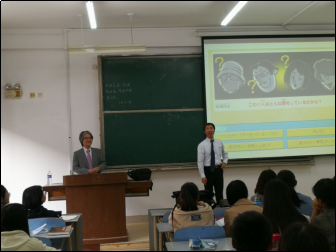 讲座伊始,李光贞教授首先代表日语系全体同学对藤田大辅教授与鲍良教授的到来表示了热烈的欢迎与诚挚的感谢。讲座开始后,藤田教授首先介绍了进行日本防犯教育教材和安全促进学校活动受到社会各界重视的直接原因:2001年6月8日,一名男子持刀冲进大阪教育大学附属池田小学,致使8名儿童死亡、13名儿童和2名教员身负重伤。为了防止此类事件再发生,进行积极的学校安全促进活动就显得非常必要,同时对受害者身心健康进行长期的关注也成为重要课题。随后,藤田教授对“e-learningシステム”的特点、实践流程、试点学校进行讲解:该系统从学生自身情况出发,通过学习与反思和再学习来提高学生的安全意识。藤田教授为同学们展示了这个安全学习系统的部分页面,同学们对页面的趣味性和问题的具体性表现出浓厚的兴趣。藤田教授同时展示了安全学习系统试点的效果:接受学习的儿童安全意识和安全行动得到改善,校内受伤事件减少,等等。最后,藤田教授表示,希望学校安全促进活动能够得到持续发展,把安全学习系统带到更多的国家,让更多的儿童安全意识得到提高。