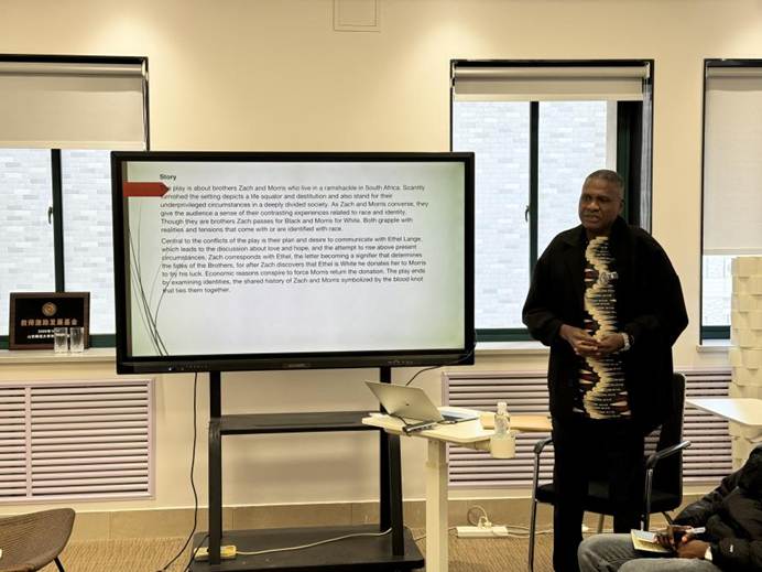 2025年12月8日上午,第三期“非洲文学与非洲研究”系列讲座于英国正版365首页英国365圆满举办。本次活动由山东省与东非地区交流合作研究中心、英国正版365首页、365(vip)英国上市区域国别研究院、365(vip)英国上市肯尼亚研究中心联合主办,我院特聘教授、肯尼亚肯雅塔大学斯瓦西里语及非洲语言系教授Richard Makhanu Wafula担任常驻主讲嘉宾,以“The Question of Identity in African Drama: Athol Fugard : The Blood Knot”为主题展开深度分享,各专业研究生共同参与本次学术交流。