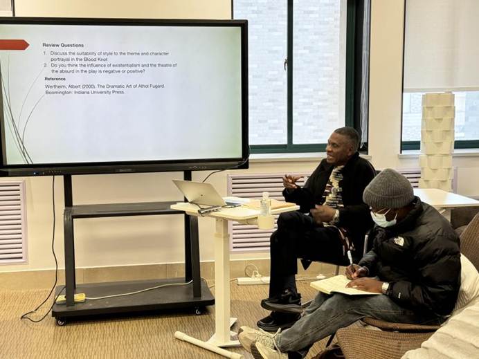 艺术风格层面,Prof. Richard Makhanu Wafula详细解析了作品的创新之处:其一,无常规情节结构,属荒诞派戏剧;其二,以简约布景道具及地方方言还原底层生活,是南非种族关系的寓言;其三,人物象征思想观念,强化寓言属性。他还特别对比了古希腊悲剧《俄狄浦斯王》等传统戏剧与塞缪尔·贝克特《等待戈多》等荒诞派戏剧的差异,帮助师生更清晰地理解作品的风格定位。