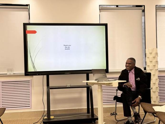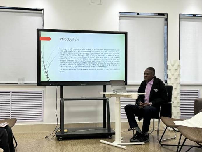 讲解环节,Prof. Richard Makhanu Wafula 结合非洲文学文本与文化背景多维度解析:先阐释非洲异质性与同质性的悖论,强调和平与发展方案需兼顾本土与全局;再介绍传令官、谚语等本土和平构建符号与沟通策略;接着指出发展需本土、国家与国际协同参与,且性别包容是关键;还探讨了非洲治理革新、科技赋能的正负效应,分析外部干预等现实挑战,并提出文化产业与本土理念的实践价值。