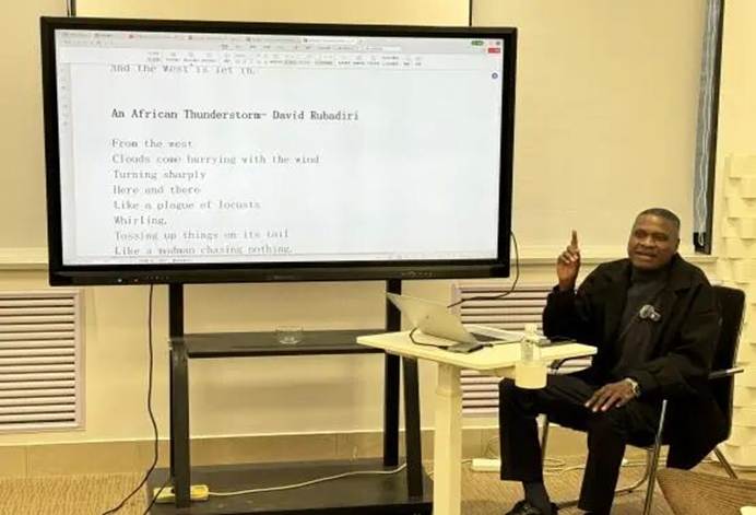 提及现代书面诗歌,Prof. Richard Makhanu Wafula带领师生朗读并深度解析。从Stanley Meets Mutesa中殖民接触的复杂图景,到An African Thunderstorm里自然风暴与社会动荡的隐喻交织;从Africa My Africa中对非洲历史、苦难与文化根脉的深情回望,到We shall return中对故土解放与家园重建的坚定信念,教授的深情朗诵与讲解,让师生直观感受非洲诗歌的情感张力。