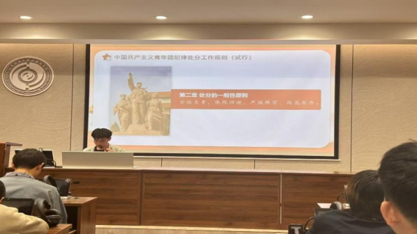 首先,辛雅纯围绕为什么要抓团的纪律建设以及团的纪律的具体内容进行详细讲解,她表明共青团作为中国共产党的助手和后备军,必须始终保持先进性和纯洁性。团的纪律不仅是对团员行为的规范,更是对青年政治品格的锤炼。随后,马子鑫就有关中国共产主义青年团纪律处分工作的规则进行分享,他讲到,团的纪律处分不是目的,而是教育和帮助团员改正错误、健康成长的重要手段。纪律的执行既要严格规范,又要体现组织的关怀。他号召广大入团积极分子应当正确对待纪律处分,主动接受组织教育,积极传递正能量。