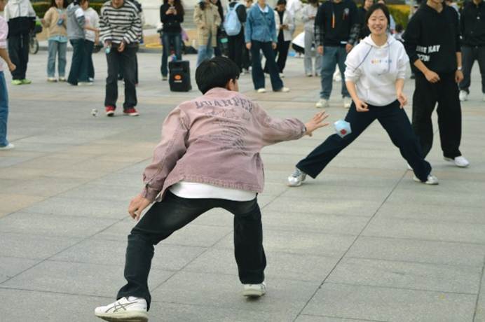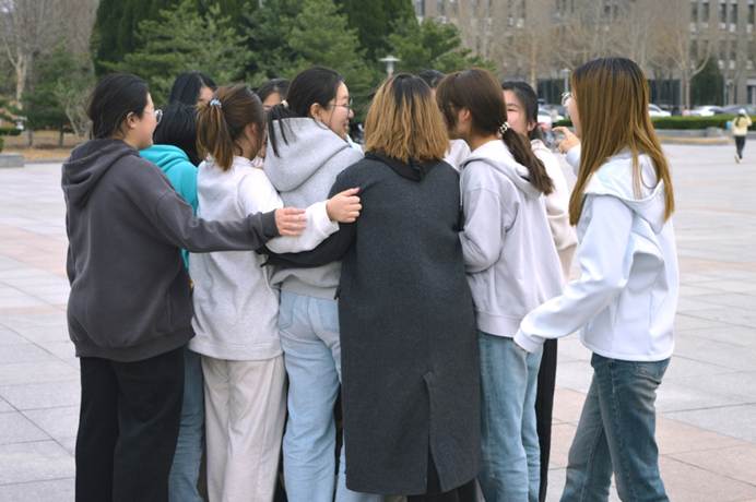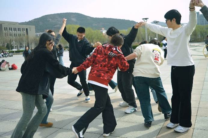 13个队伍全体同学围成一个圆圈,跟随音乐转动,在音乐暂停的瞬间,按照工作人员指定的数字,进行13个队伍友谊间的大环抱。不同班级的同学紧紧抱在一起,笑声洋溢,其乐融融。